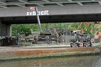 De zesentachtig jaar oude brug werd zaterdagavond met behulp van een ponton opgetild tot deze niet meer op zijn bevestigingspunten steunde. Vervolgens werd de brug met een snijbrander in verschillende kleinere delen gesneden die met een kraan op de kade werden gelegd.